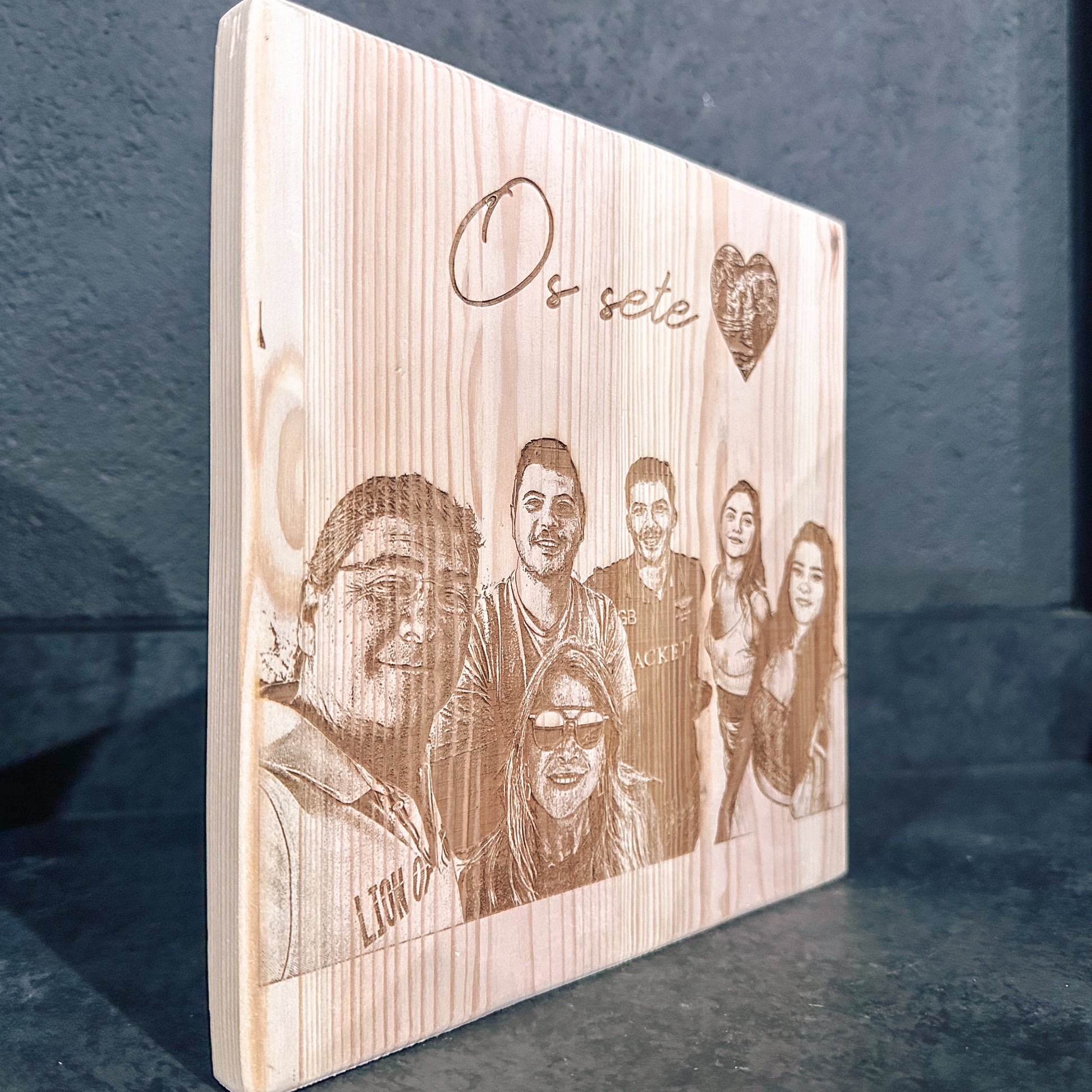 Este bloco de madeira maciça de 23x23 cm e 10 cm de espessura foi pensado para exibir fotografias gravadas a laser – sejam recordações de família, de amigos, ou retratos singulares – em uma peça que fica de pé com elegância.